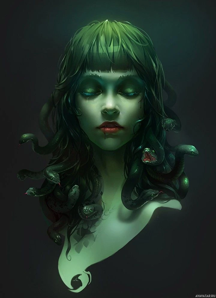 a female figure with long hair that appears to be made up of writhing snakes, which is reminiscent of the mythological character Medusa, also known as the Gorgon. The figure has