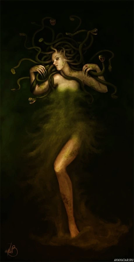 The image depicts a fantastical artwork of Medusa,