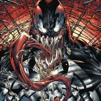 The image shows a comic book illustration of the character Venom, who is known for his distinctive