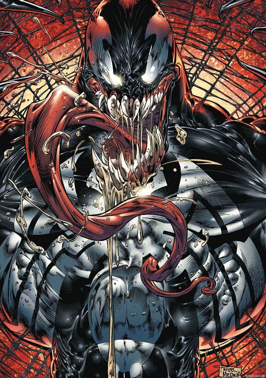 black suit and red spider-like symbiote that attaches itself to human hosts. In this particular depiction, Venom's mouth is open, revealing