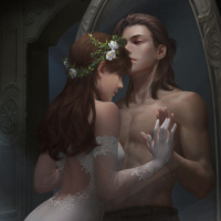 wavy hair and is not wearing any upper clothing, revealing his bare torso. The setting appears to be indoors, possibly in a room with an antique or vintage theme, indicated by the presence of what looks like a vase or