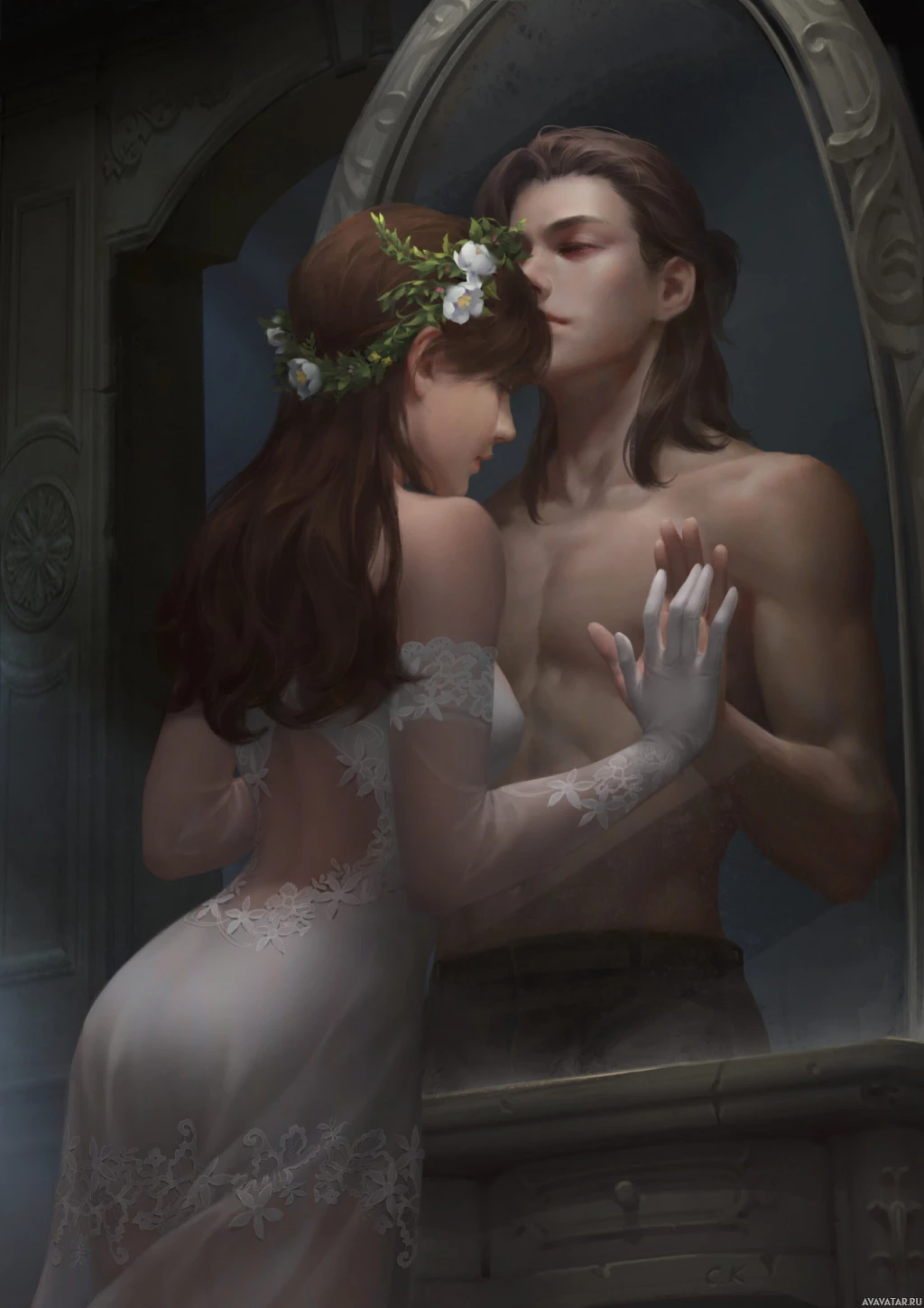 flowing hair is wearing what appears to be a bridal dress, suggesting she may have just gotten married or is celebrating her wedding day. She is embracing and kissing
