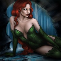Poison Ivy from the Batman comics. The character is seated on a ledge with water dripping around them, suggesting an underground or cave-like environment. This character is known for being a complex antagonist to Batman and is often associated with themes of nature, growth, and seductive power in the comic