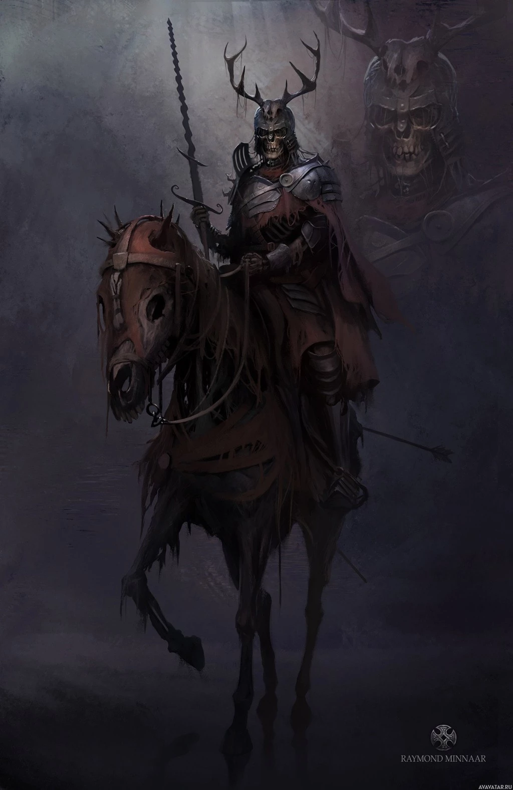a fantasy scene featuring a knight riding on a horse. The knight is wearing armor and has antlers, which may suggest that the character could be associated with mythological or fantastical elements. In the background, there are two figures that resemble skeletons, which adds to the eerie and otherworldly atmosphere of the scene. The setting appears dark and mysterious, enhancing the mystical theme commonly found in