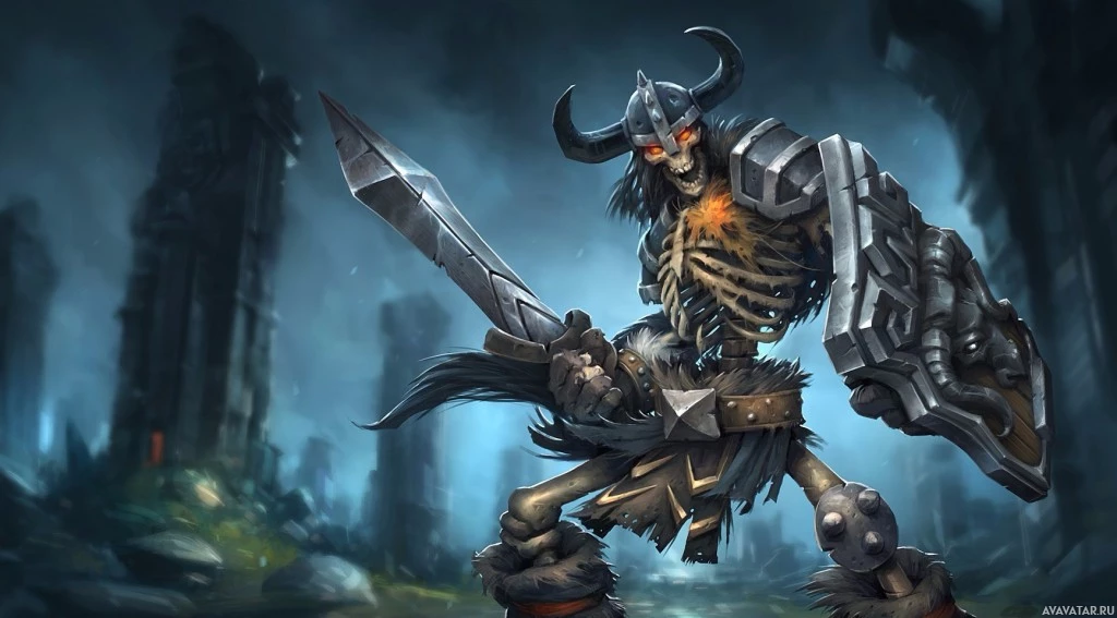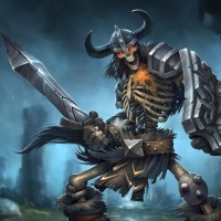 a skeletal creature holding a sword and wearing armor, which suggests it could be a warrior or guardian of sorts. The environment around the character appears to be a dark,