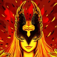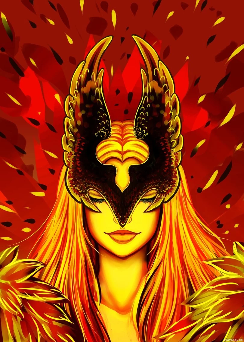 the video game Dota 2. This character is adorned with a mask that resembles a phoenix or a bird of some sort. The mask has prominent beak-like protrusions and is surrounded by flames in various