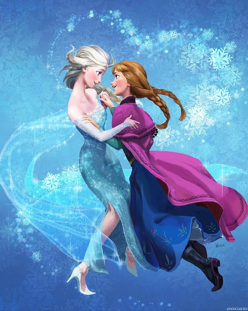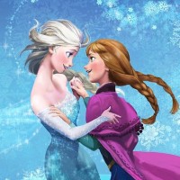 animated characters from the Disney movie "Frozen." On the left is Elsa, who is wearing a blue dress and has long