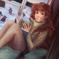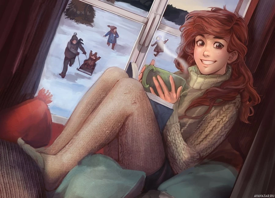 hot cocoa or tea, adding to the warm and inviting atmosphere of the scene. Behind her, an open window reveals a snowy scene outside where several people and dogs can be seen, which contrasts with the girl's cheerful