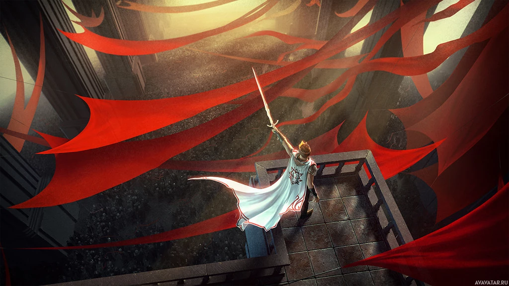 a fantasy scene featuring a character wielding a sword. This character is wearing a cloak and a crown, suggesting a regal or royal status. The setting appears to be