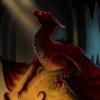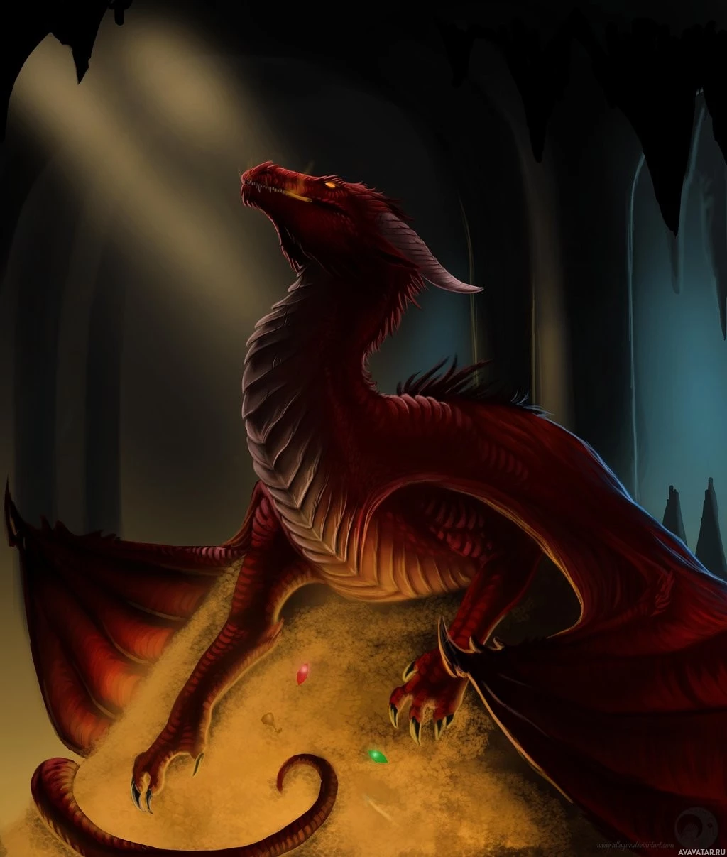 a fantastical setting. The dragon's scales are red, which is a common color for these