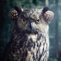 a natural setting, possibly in a forest or wooded area, which is suggested by the blurred background that looks like tree bark. The owl's expression seems somewhat stern or focused. This image is likely meant to be humorous due to the unusual sight of an owl wearing what appears to be earmuffs, which adds a whimsical element to the otherwise