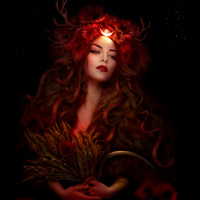long hair and is holding what appears to be flowers in one hand and a red object, which could be a fruit, in the other. The overall color scheme includes reds, browns, blacks, and whites, giving it a somewhat eerie or mystical atmosphere. The art style suggests she might be
