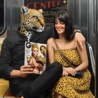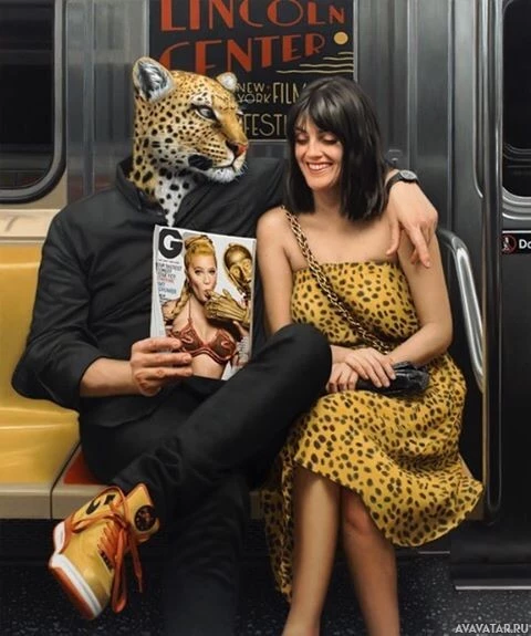 a subway train. One person is wearing a leopard costume and holding a magazine that features a woman in