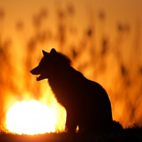 На картинке изображен силуэт лисы (или волка) перед ярким закатом. Животное сидит или стоит на травянистой равнине, глядя на горизонт, где садится солнце.