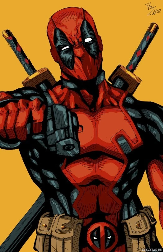 The image features a character known as Deadpool, who is a fictional superhero appearing in American