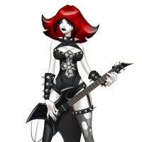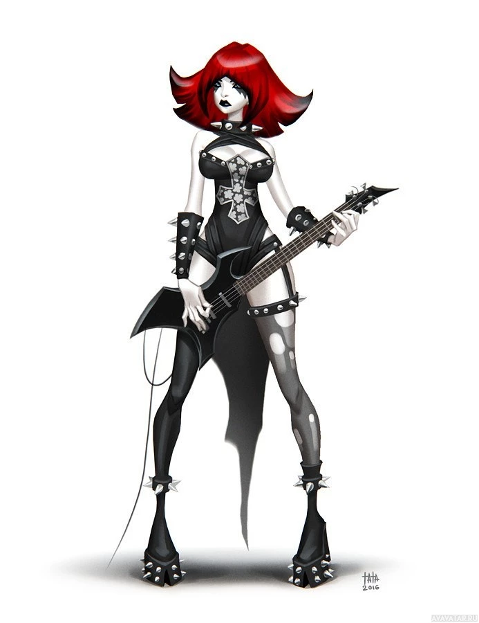 red hair and is dressed in a black outfit that includes spiked armor with straps, a corset top, thigh-high boots, and fingerless gloves. In her hand, she holds