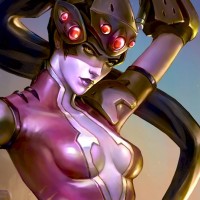 the video game "Overwatch." This character is known as Widowmaker, and she is depicted with her arms outstretched in a pose that suggests agility or readiness for combat. She has white skin and features distinctive pink and black attire, which includes a mask covering her eyes and an elaborate chest piece with