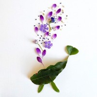 purple flowers with yellow centers that resemble seashells, which could be interpreted as the 'shell' part of the whale. To the right of these flowers is a dark-colored leaf that could be seen as the 'fin' of the whale due to its shape. The arrangement gives the impression of