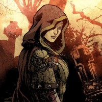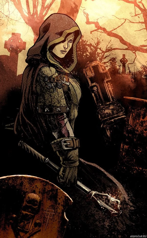 a hooded cloak and holding a sword, suggesting she might be a warrior or a guardian of some sort. She's standing among ruins, which gives the scene a somewhat somber or battle-weary atmosphere. There are also elements like skulls and bones scattered in the background, adding to the darker tone of the image. The art style is dynamic with