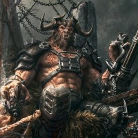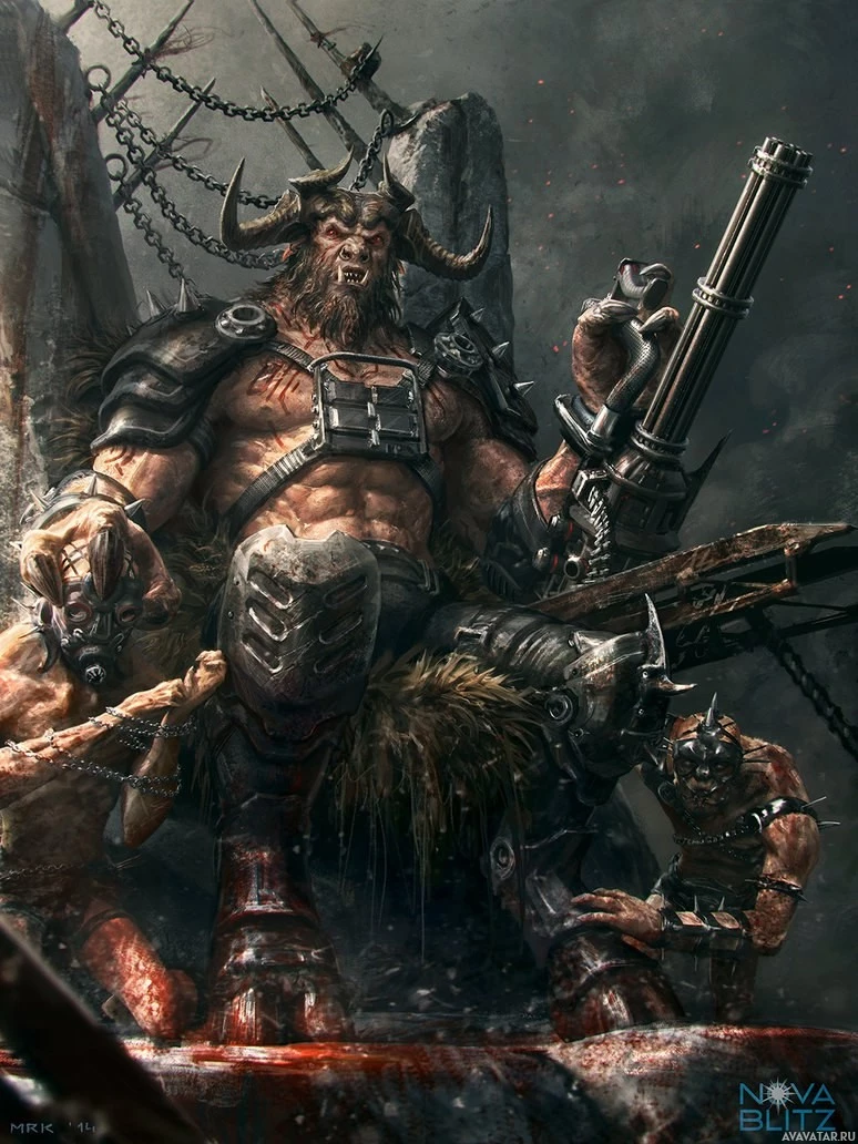 a fantasy scene with a humanoid figure that resembles a minotaur, characterized by its bull-like head. The creature is seated on a throne or an elevated platform, holding what appears to be a weapon and is surrounded by other figures that could be considered demons or
