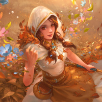 На картинке изображен женский персонаж с рыжими волосами, одетый в плащ или куртку с капюшоном. Она сидит на земле в том, что выглядит как лесная обстановка осенью, о чем свидетельствуют опавшие листья, окружающие ее. Персонаж имеет безмятежное выражение и, кажется, наслаждается осенней листвой.