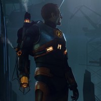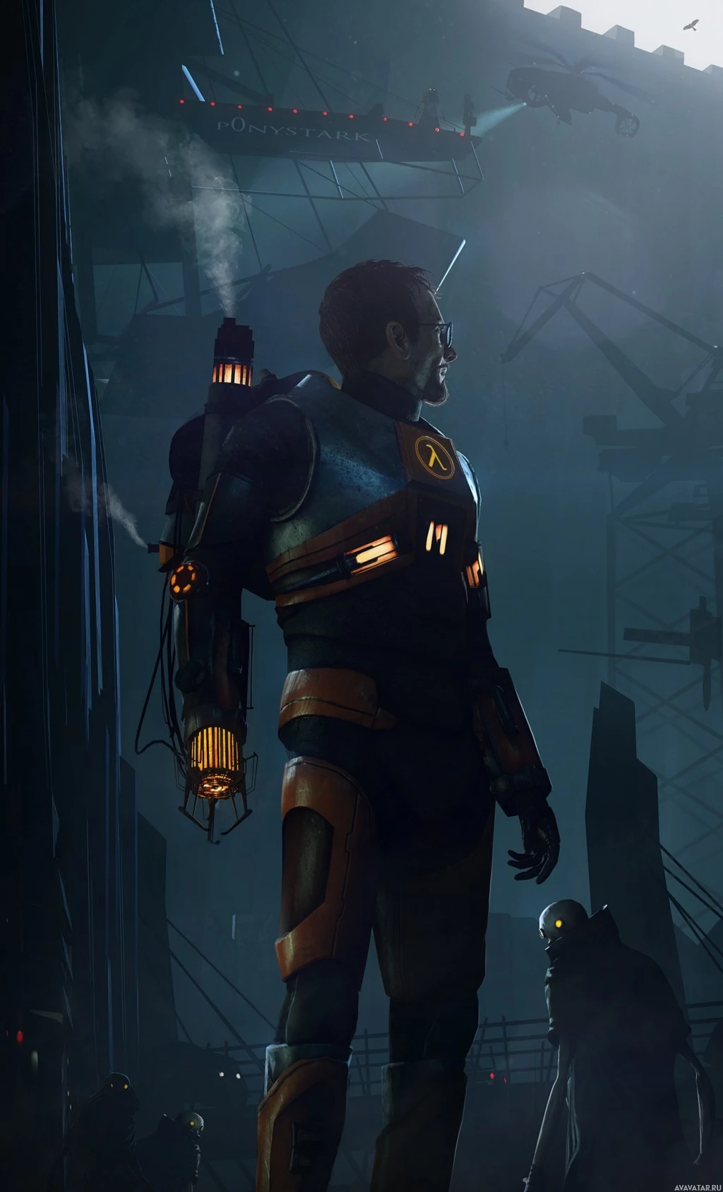 the video game "Half-Life." It features a character wearing an advanced, powered