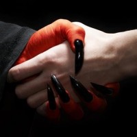 human hands that are intertwined in a gesture of agreement or pact. One hand has long black nails, which suggests the presence of a demonic or dark character, and this hand is wearing what appears to be