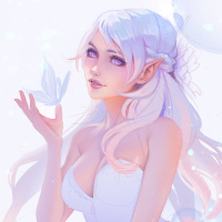 The image features an illustration of a fantasy character. She appears to be an elf with white hair, wearing what looks like a fairy or angelic outfit. The background suggests a magical setting, possibly a forest or a garden, with light particles that give the scene a mystical atmosphere.