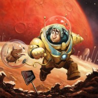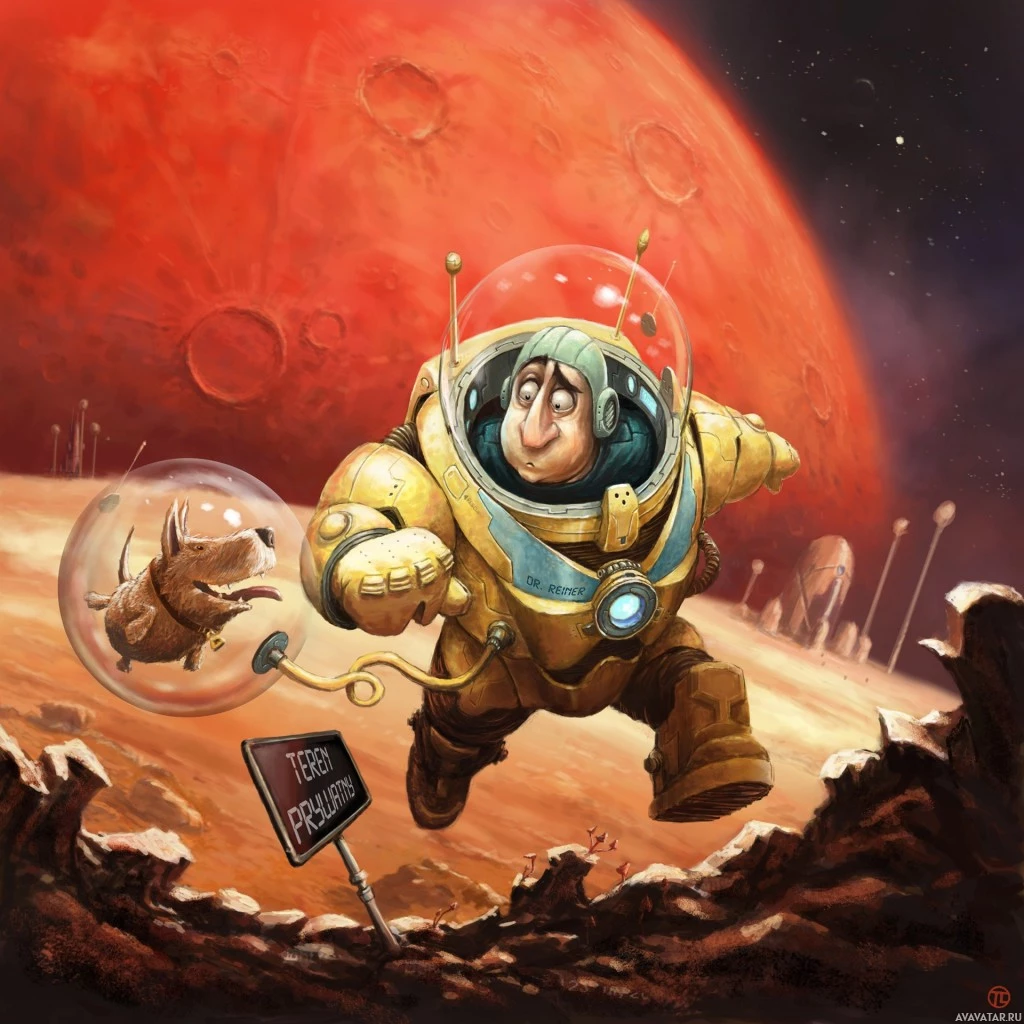 the red planet in the background and what looks like Martian terrain beneath the astronaut's feet. Accompanying the astronaut is a dog inside