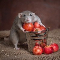 The image shows a rat holding onto the edge of a metal bucket containing