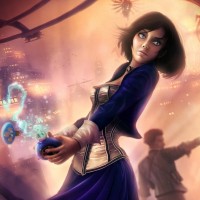 the video game "Bioshock." The character is depicted as a girl in a steampunk-inspired costume, holding a device that resembles a cross between a handheld