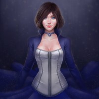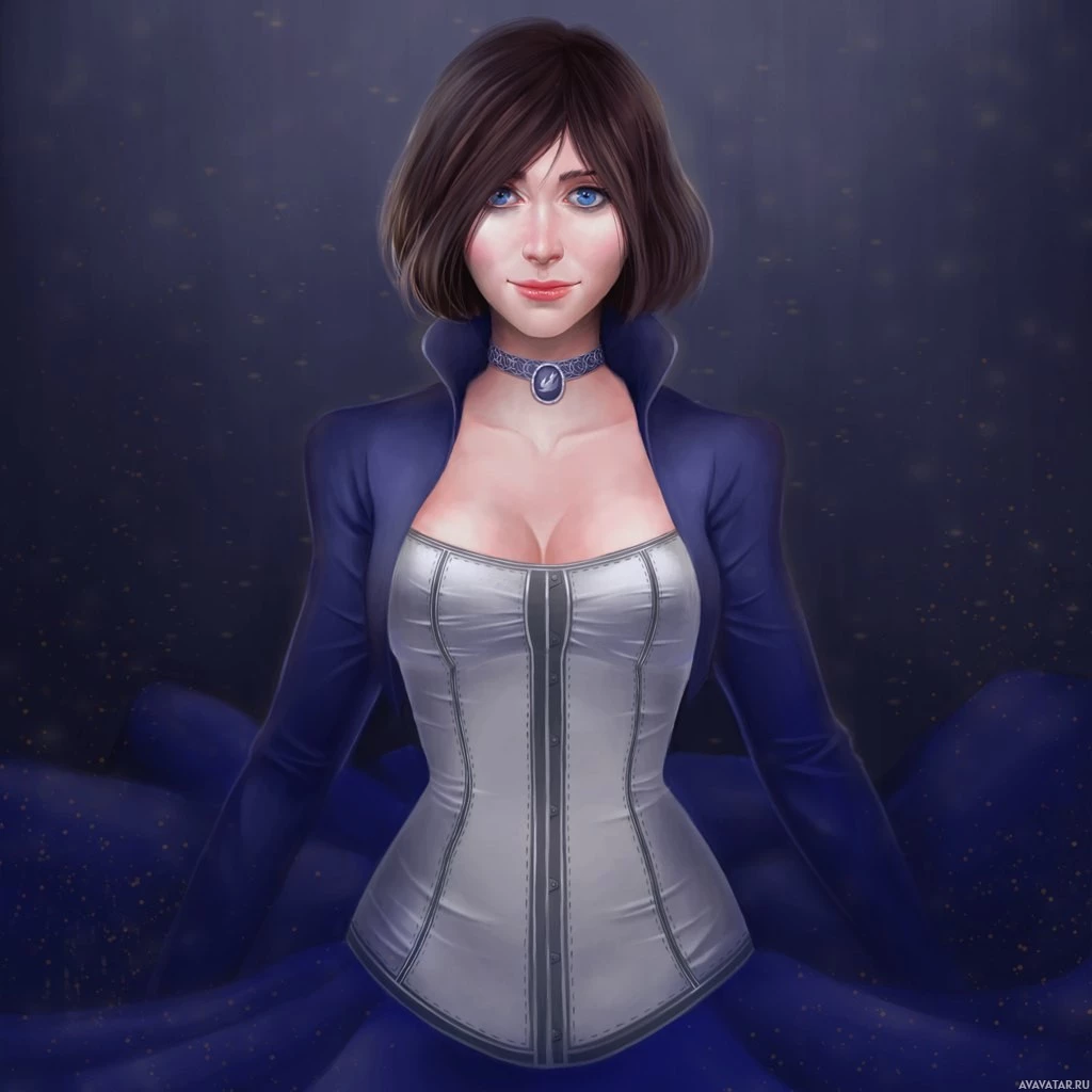 an animated character designed in a style reminiscent of the games from the "Bioshock" series. She is wearing attire that resembles vintage or