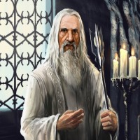 a stern expression on his face. He is dressed in traditional wizard's robes and holds a staff, which is characteristic of his role as