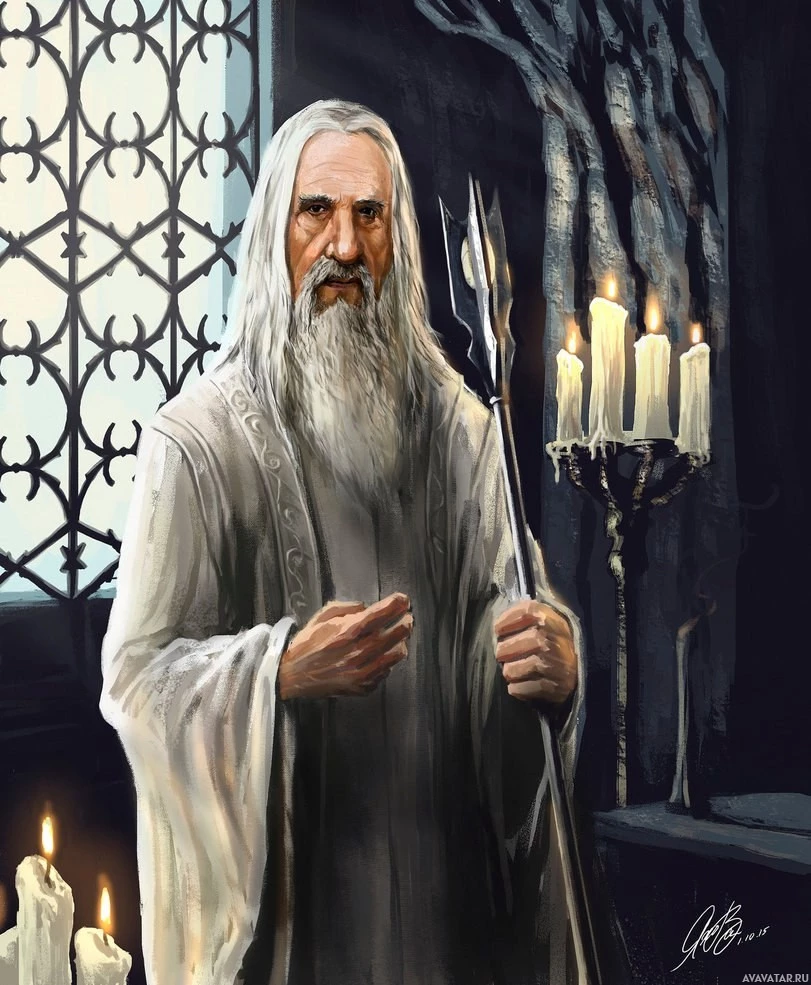 a fictional realm where much of the story takes place. Saruman is standing in front of a large window or arched doorway with candlelight shining from it, and he has