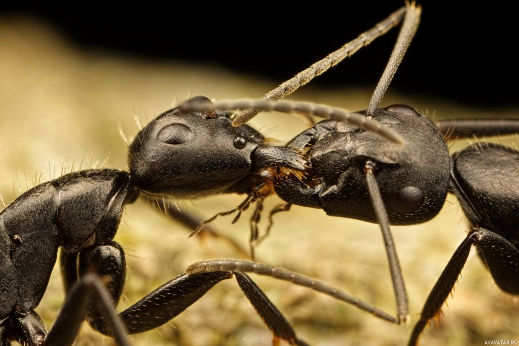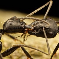 The image shows two ants interacting closely. One ant appears to be biting or pinching the other, which could indicate a form of communication or behavior between them. Ants are known for their