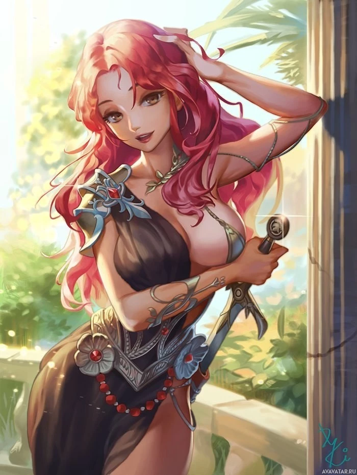 female warrior or adventurer, as indicated by the sword she is holding. The character is wearing a stylized