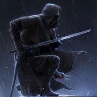 video game series. This character is dressed in what appears to be historical or fantasy-themed clothing, complete with a hood and cloak, holding a sword. The setting seems to be during