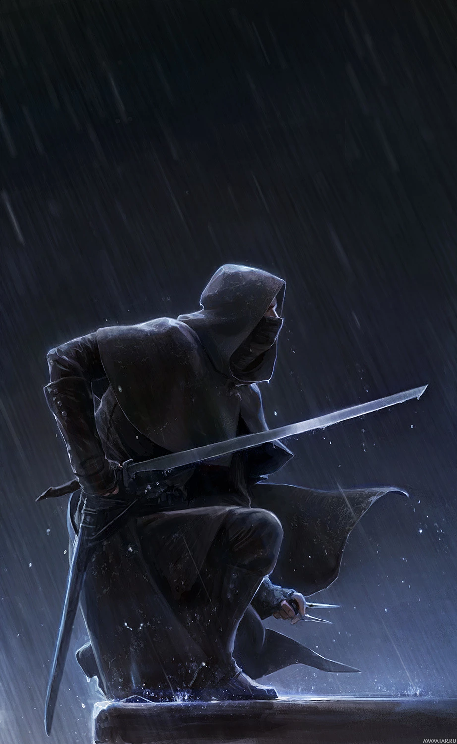 heavy rain, which adds an atmospheric element to the scene. The character is crouching on what might be a rooftop or some other