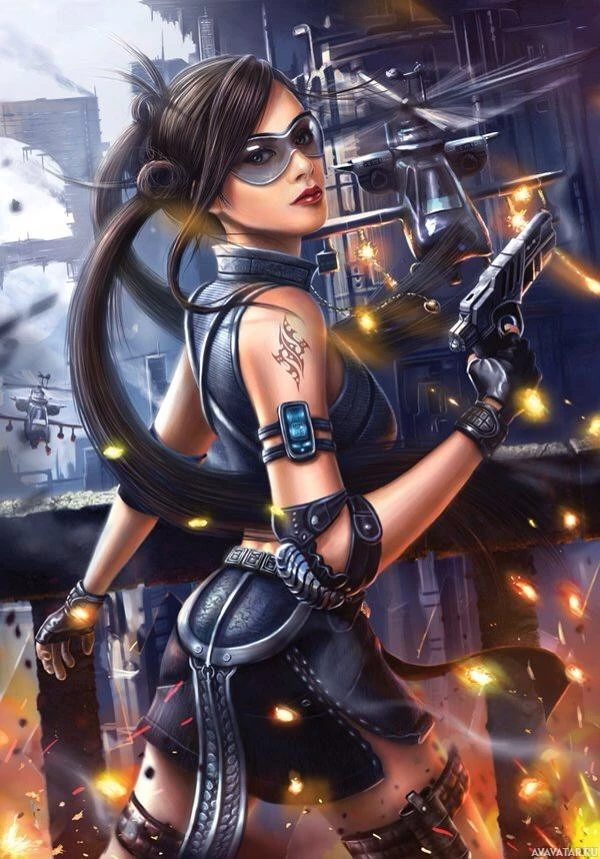 dark hair and is wearing what appears to be a tactical vest or armor with various straps and buckles. In her hands, she holds a pistol, which is pointed downwards. Her attire includes a shirt with a visible emblem on the right shoulder, possibly indicating a role as a warrior or