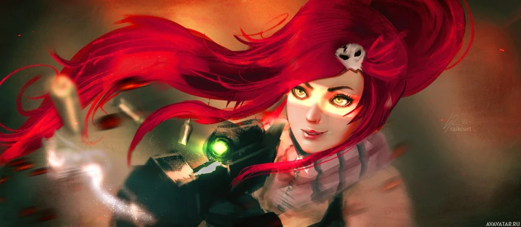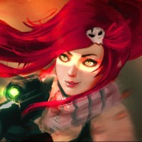 red hair, wearing what appears to be a goggles or mask, and holding what looks like a weapon. She is standing against a backdrop that has an eerie or dystopian feel to it. The style of the artwork suggests it could be related to