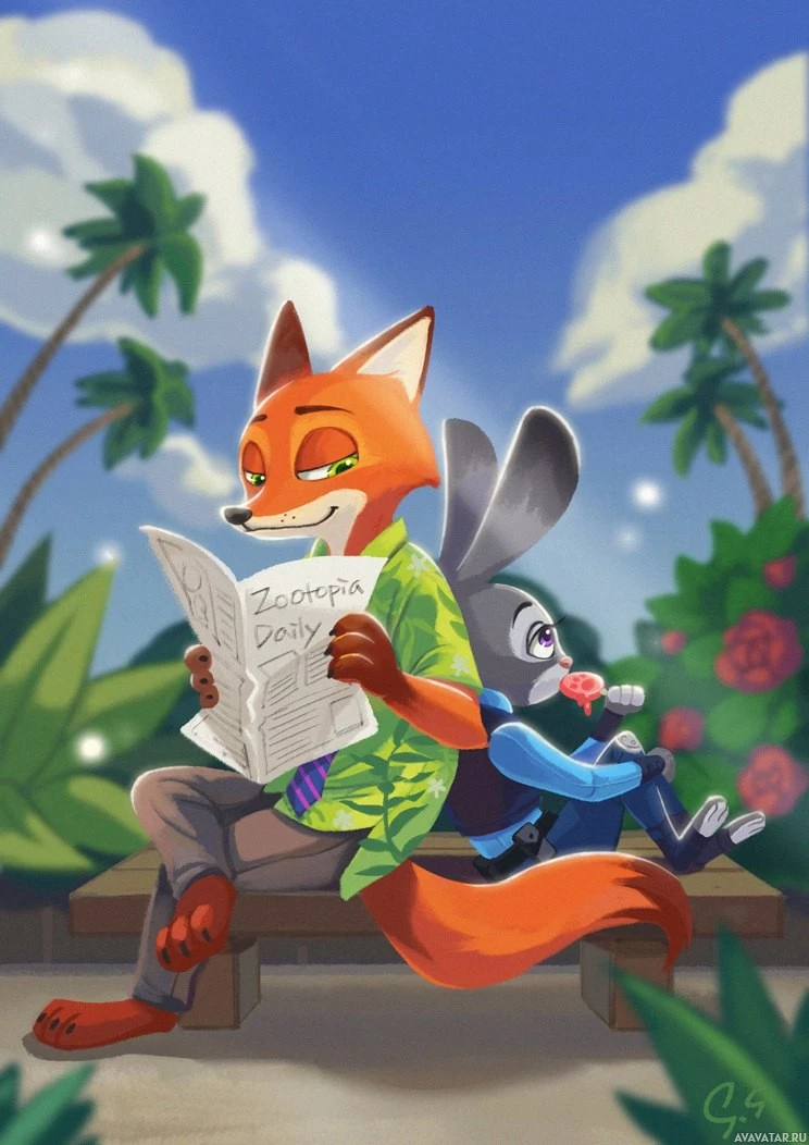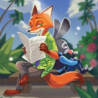 animated characters, a fox and a rabbit. The fox is sitting on a bench and reading a newspaper with the headline "Zootopia Daily". The rabbit is also on the bench, sitting in front of the fox, with its hands behind its back. Both characters appear to be enjoying