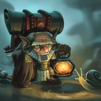 serious mood. In the foreground, there are two snails on what looks like a trail through a forest or jungle environment. One snail is closer to the dwarf than the other. A lantern is held in front of them, illuminating their shells and adding depth to the scene. The light from the lantern casts shadows and highlights that bring out details on the snails and the surrounding foliage. Overall, the image captures a moment between an elderly dwarf and two snails in a forest-like setting, evoking a sense of adventure or exploration typical of fantasy narratives.