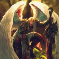 an angelic figure with wings, standing amidst a forest-like setting. This figure is holding a sword and appears to be in