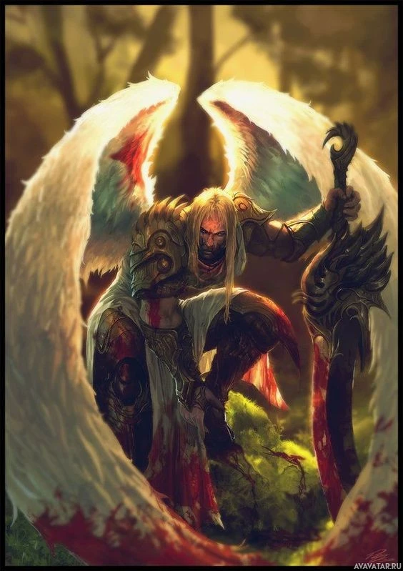 blood on the ground and possibly on the angel's armor or clothing. The artwork has elements that could be associated with