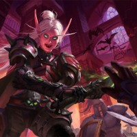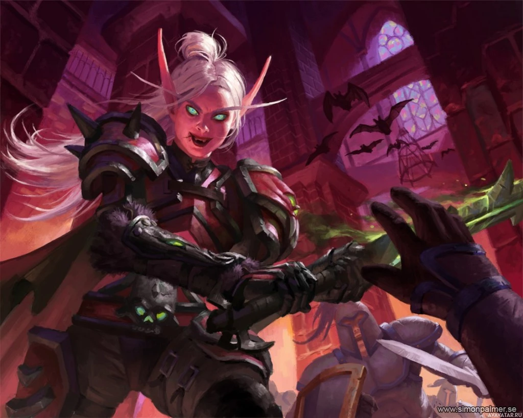 a fantasy scene featuring an elf warrior. She is prominently featured in the center of the picture, wearing armor with a helmet that partially covers her face and has pointed ears, which are characteristic features of fantasy-styled elves. She's holding a sword at the ready position and appears to be standing within
