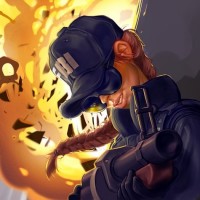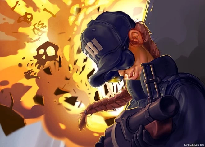 law enforcement or a similar role, as indicated by the badge and hat. She is also holding what appears to be a firearm in her hand. There's an explosion occurring behind her, and the scene has a cartoonish or artistic quality to it rather than