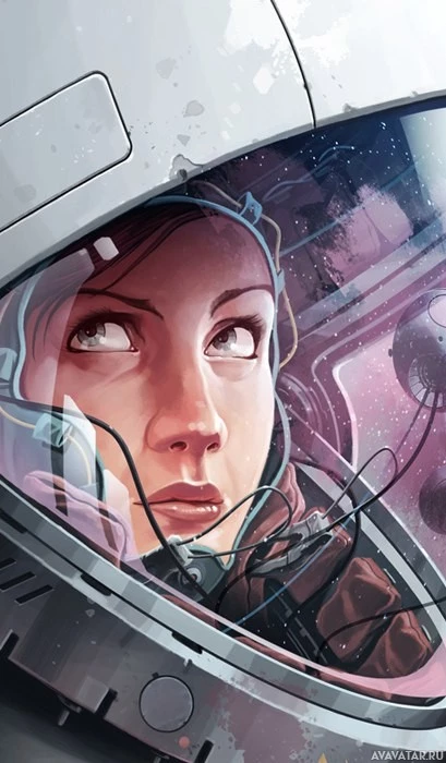 На картинке изображена иллюстрация женщины-космонавта. Она носит скафандр со шлемом, и ее лицо показывает сфокусированное выражение, глядя вперед. Художественное произведение подробно и ярко, запечатлевая суть освоения космоса и мужественный характер тех, кто отправляется в космос.
