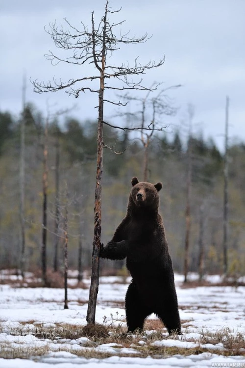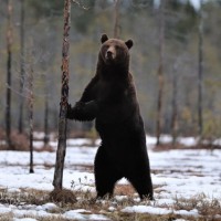 adult bear with fur that is dark brown or black, which is typical for such species. Behind the bear are pine trees and what looks like