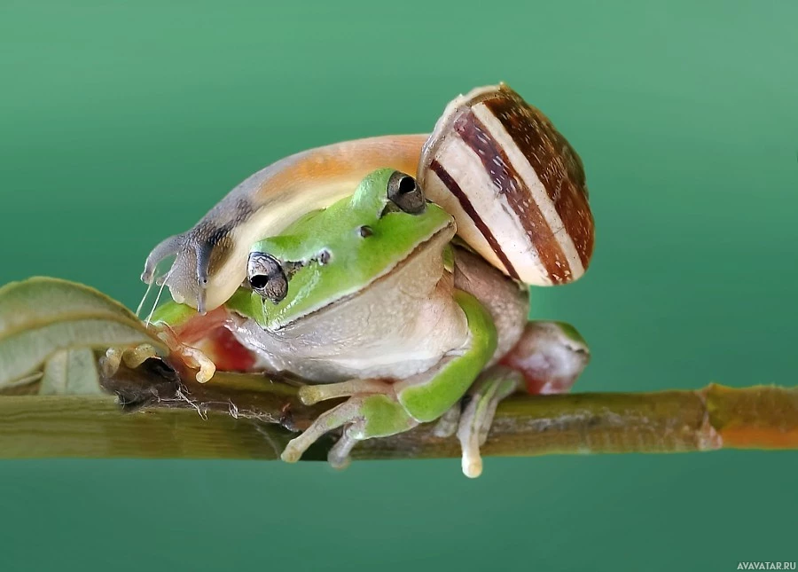 The picture shows a frog and a snail. The frog appears to be in the process of eating or interacting with the snail, which could also be mistaken for an egg due to its size and coloration. This interaction is typical for frogs as they often consume other