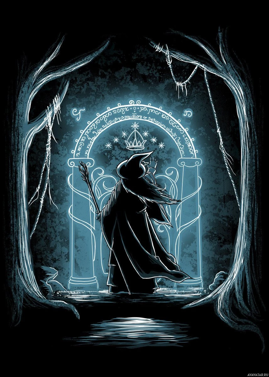 На этом изображении изображен силуэт Гэндальфа из серии «Средиземье», стоящий во входе или портале, который имеет мистический и магический вид. Окружающая среда излучает мистическую и очаровательную атмосферу, с деревьями и светящимся синим светом, освещающим сцену. Стоит отметить, что это цифровое произведение искусства, а не фотография из фильмов или книг о Средиземье.